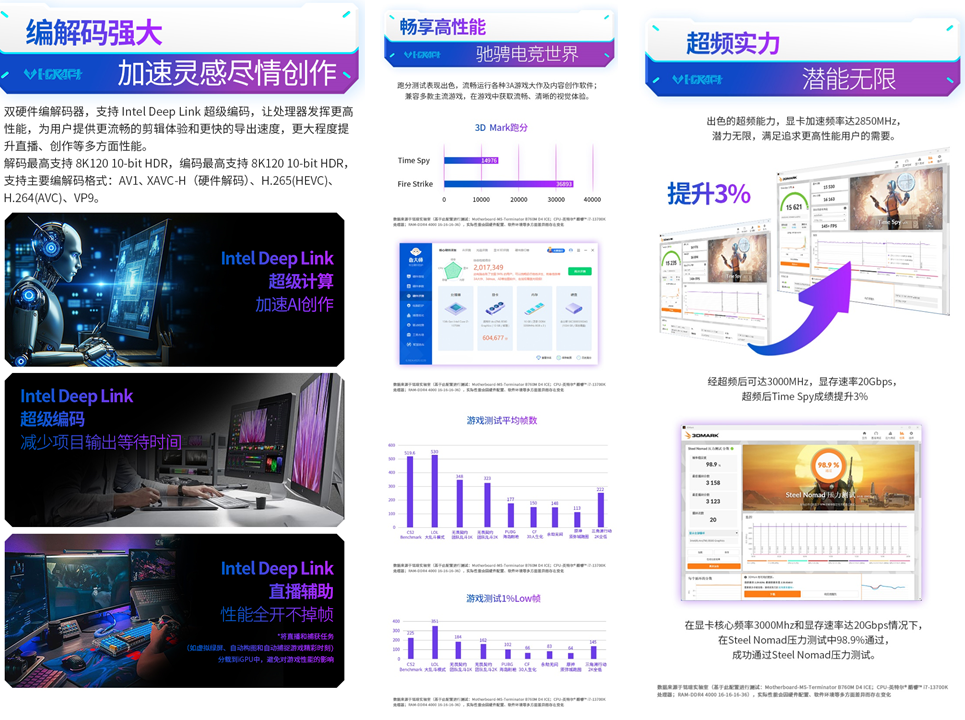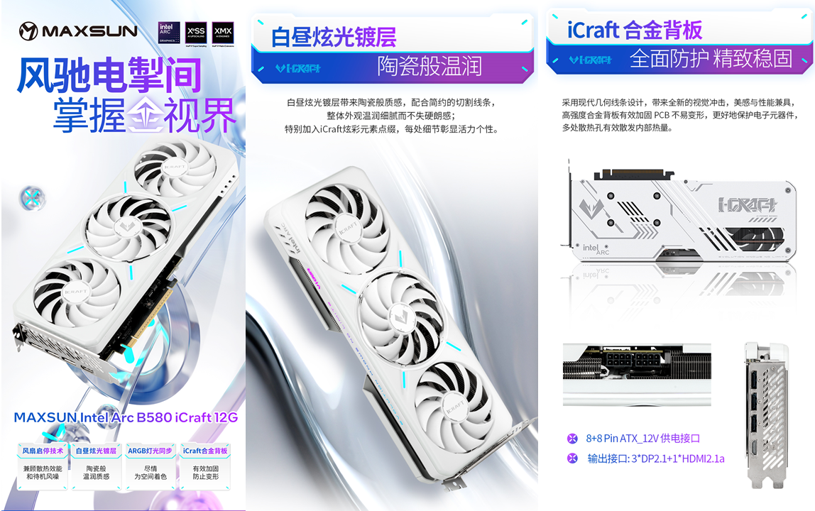 除了強散熱優勢,這款顯卡還擁有高頻率的卓越潛能。MAXSUN Intel Arc B580 iCraft 12G出廠Turbo頻率高達2850MHz,通過在驅動中進行超頻,頻率甚至可以進一步提升至3000MHz以上,滿足追求更高性能的用戶需求,讓《戰地 6》的高幀率、高畫質表現更上一層樓。接口方面,提供3個DP2.1和1個HDMI2.1a輸出接口,多屏體驗、高清視覺盡在掌握。此外,它的編解碼能力也十分卓越,雙硬件編解碼器支持AV1、H265和H264等主流編解碼格式,還支持了HAVC-H解碼,不僅能為游戲直播提供清晰流暢的畫面輸出,更能為專業攝影剪輯帶來高效體驗,兼顧游戲與創作雙重需求。