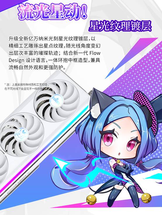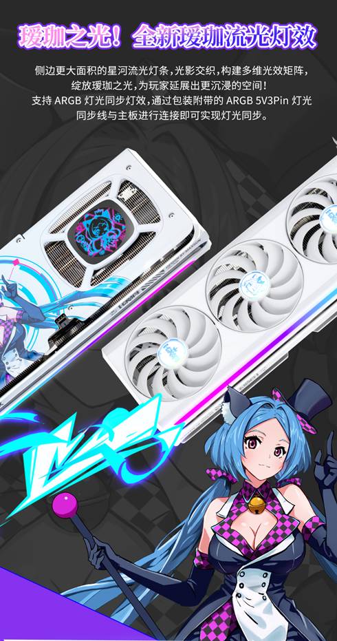 燈效方面,這款顯卡具備更大面積的側(cè)邊星河流光燈條,光影交織,構(gòu)建多維光效矩陣,支持ARGB燈光同步,璦珈RGB合金背板創(chuàng)新加入夢幻撞色燈效,層疊幻彩光影,為玩家延展出更沉浸的空間。