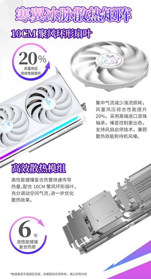 為了應(yīng)對高性能帶來的熱量,該卡在散熱效能上也進行了升級,采用3*10CM聚風(fēng)環(huán)形扇葉,集中氣流減少湍流損耗,采用高端進口滾珠軸承,噪音控制更出色,支持風(fēng)扇啟停技術(shù),兼顧散熱效能和待機風(fēng)噪。高效散熱模組快速傳導(dǎo)熱量,進一步優(yōu)化散熱效果。