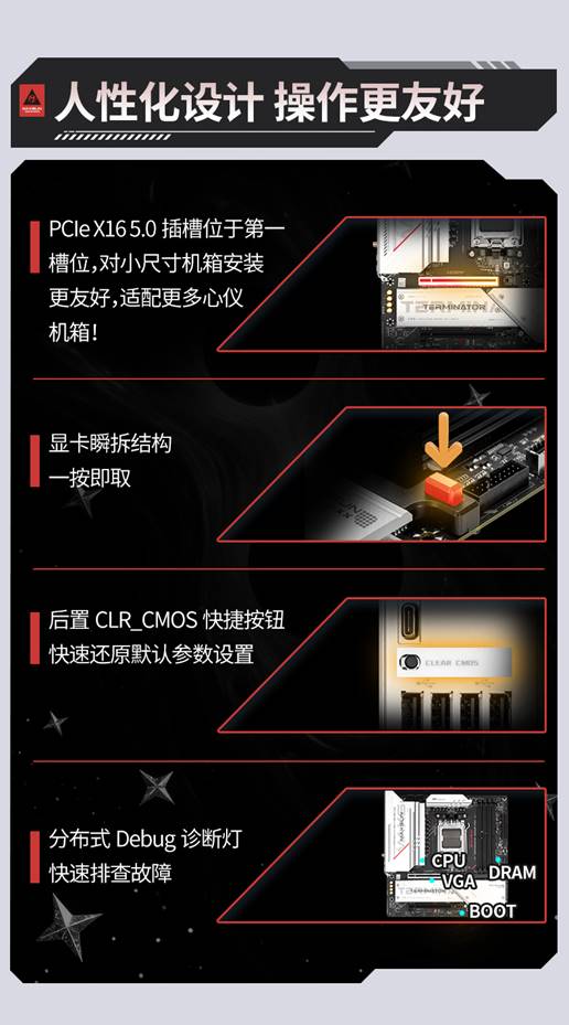 除了強(qiáng)悍的性能,銘瑄Terminator B850M PRO WIFI主板還加入了許多貼心設(shè)計(jì),如顯卡瞬拆結(jié)構(gòu),裝機(jī)維護(hù)時(shí)無需費(fèi)力拆卸螺絲;分布式Debug診斷燈能快速定位故障,小白也能輕松排查問題;CLR_CMOS快捷按鈕,讓設(shè)置重置更便捷,全程省心省力,裝機(jī)體驗(yàn)直接拉滿。